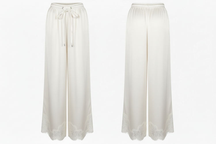 The pants feature delicate lace accents at the bottom, adding a feminine touch that elevates the overall look. This lace might have intricate patterns or scalloped edges, creating a beautiful contrast against the smooth satin.