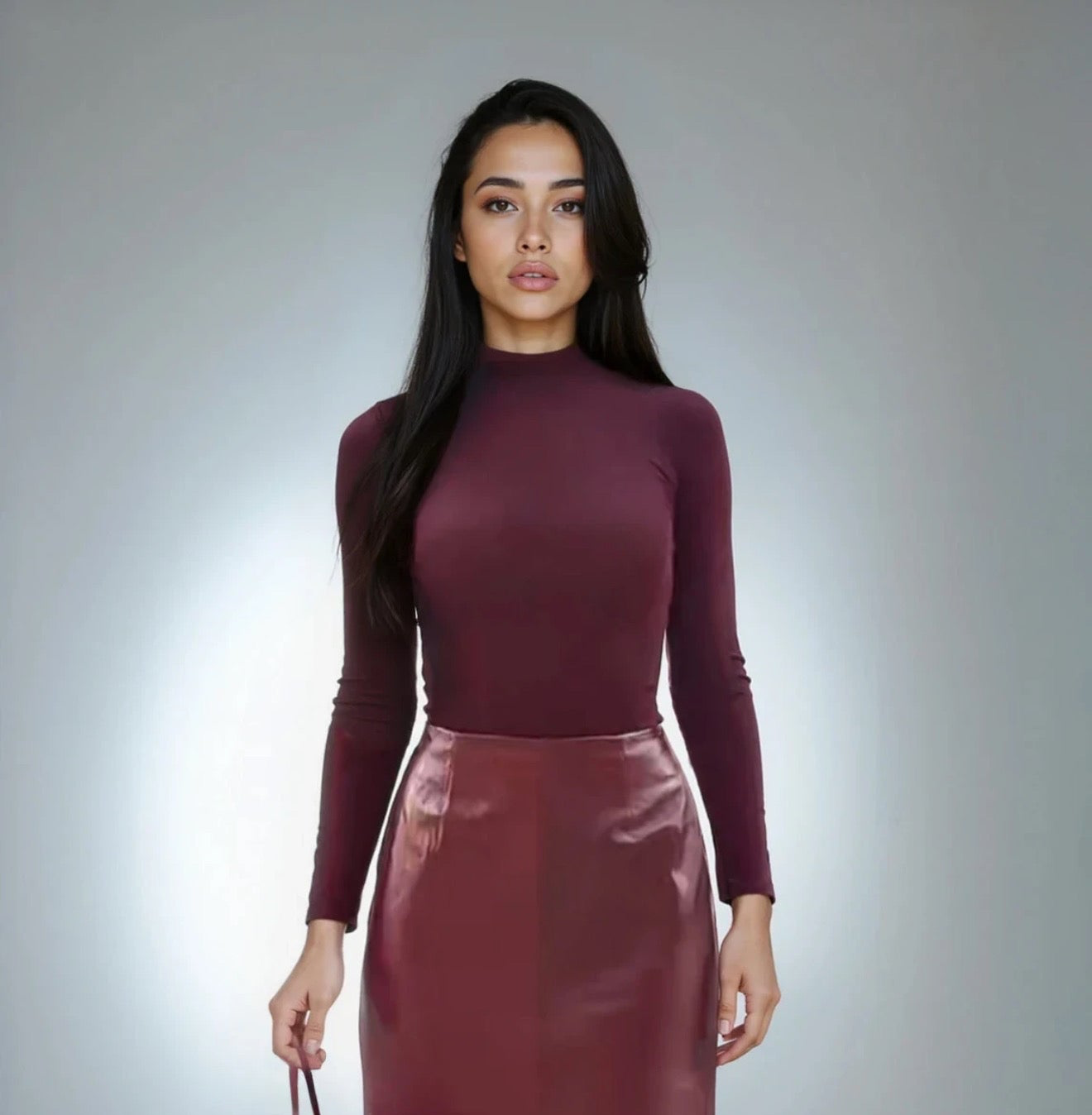 Made from a super soft jersey fabric, this burgundy red long sleeve top has a slim fit and a narrow trim around the high neckline, perfect for layering with any outfit.