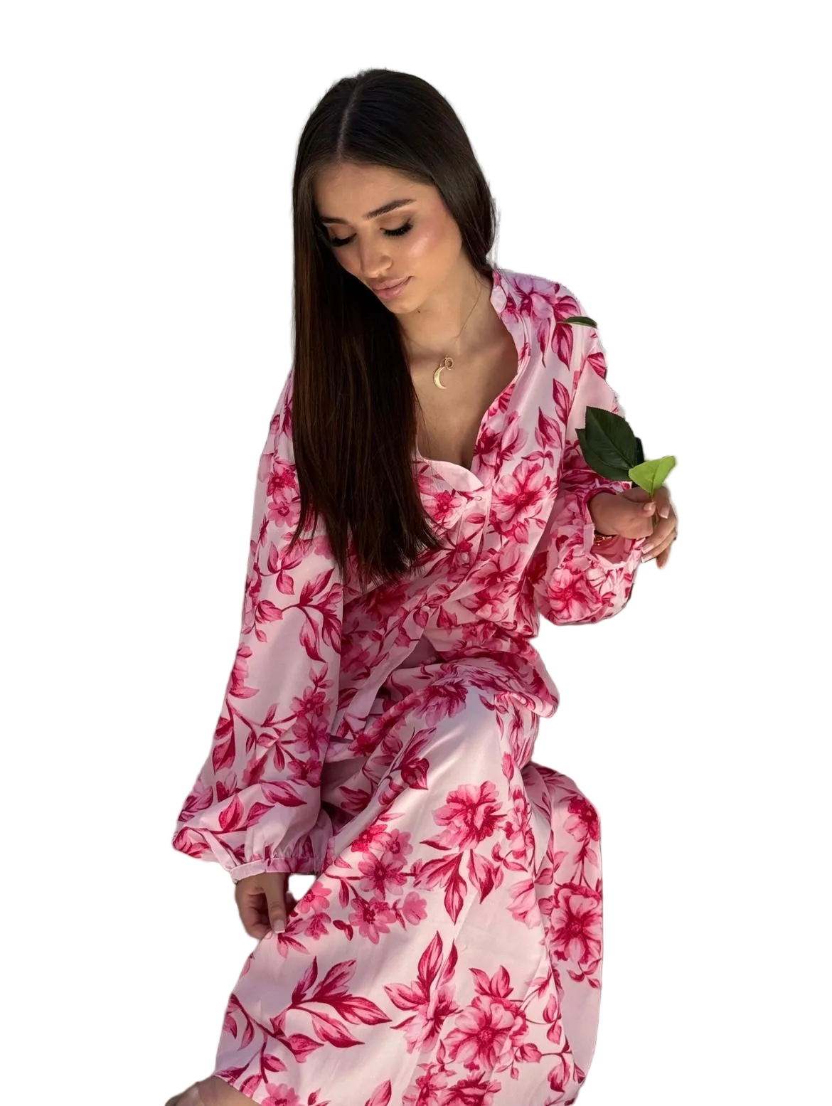 The floral matching two-piece set features a vibrant pink and blue colour palette, perfect for a fresh and lively look! The top features ruffle sleeves, showcasing a beautiful floral print that combines bold pink blossoms with soft blue foliage. The high-waisted skirt is tailored for comfort. Together, this set creates a playful yet chic outfit ideal for summer outings or casual gatherings.