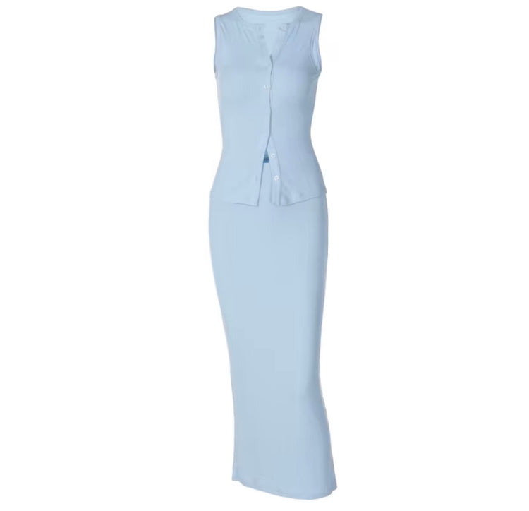 Ribbed Asymmetrical buttons cardigan tank top paired with a Maxi Skirt