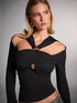 Black long-sleeve cropped top, Slim Fit off-shoulder design with twisted detail featuring gold accessories and ruched texture.