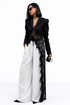 Beneath the blazer, an intricate sheer lace corset panel contours the waist and torso, showcasing an ornate floral and geometric lace pattern that adds depth and texture. The lace continues into a flowing overlay that drapes asymmetrically, creating movement and contrast against the soft ivory wide-leg trousers beneath.